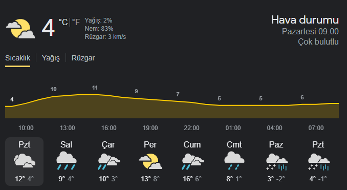Meteoroloji 10.Bölge Müdürlüğü (11 Aralık Pazartesi) Samsun için hava tahminlerinde bulundu. Hava tahminlerine göre il merkezinde en düşük hava sıcaklığı 4 derece, en yüksek hava sıcaklığı ise 12°C, az bulutlu olacak.