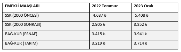 Buna göre memur ve memur emeklilerinin maaşları, toplu sözleşme zammı ve enflasyon farkı ile birlikte yüzde 16,47 zamlanırken SSK ve BAĞ-KUR emeklilerinin maaşları yüzde 15,4 arttı.