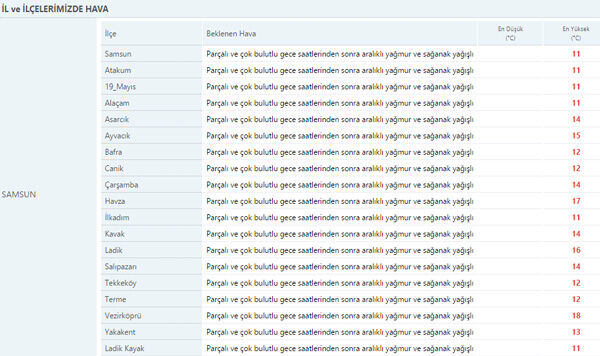 26 Mart Pazar itibariyle Samsun genelinde olması beklenen hava durumuyla günün sıcaklık değerleri şu şekilde: