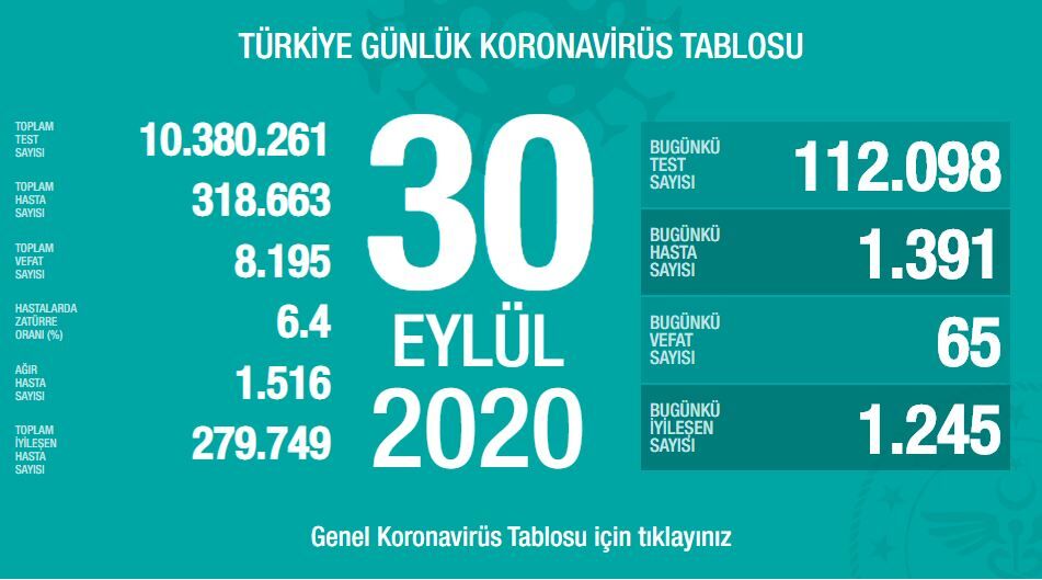 Bugün 65 kişi hayatını kaybederken bin 245 hasta yeniden sağlığına kavuştu. Son 24 saatte 112 bin 98 test yapıldı ve toplam test sayısı 10 milyon 380 bin 261'e ulaştı.