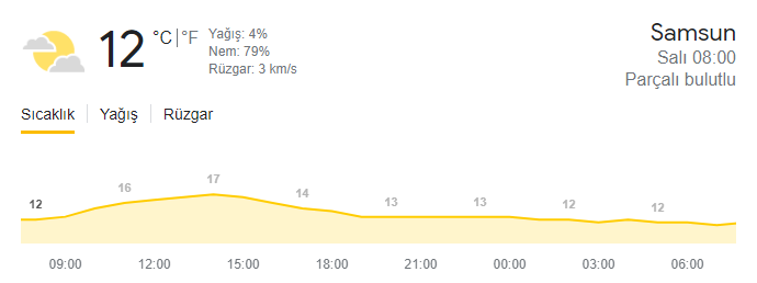 Meteoroloji 10. Bölge Müdürlüğü (4 Ekim Salı) Samsun için hava tahminlerinde bulundu. Hava tahminlerine göre il merkezinde en düşük hava sıcaklığı 12 derece, en yüksek hava sıcaklığı ise 17 derece olacak.