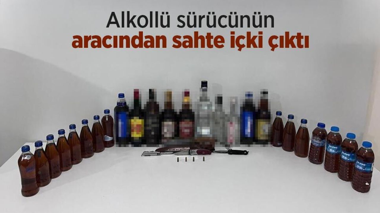 Araçta yapılan aramalarda içinde çok sayıda sahte el yapımı içki olduğu değerlendirilen şişeler, 4 adet bıçak ve 4 adet 6.35 mm fişek ele geçirildi. Ele geçirilen malzemelere el konulurken, olayla ilgili şahıs hakkında Türk
