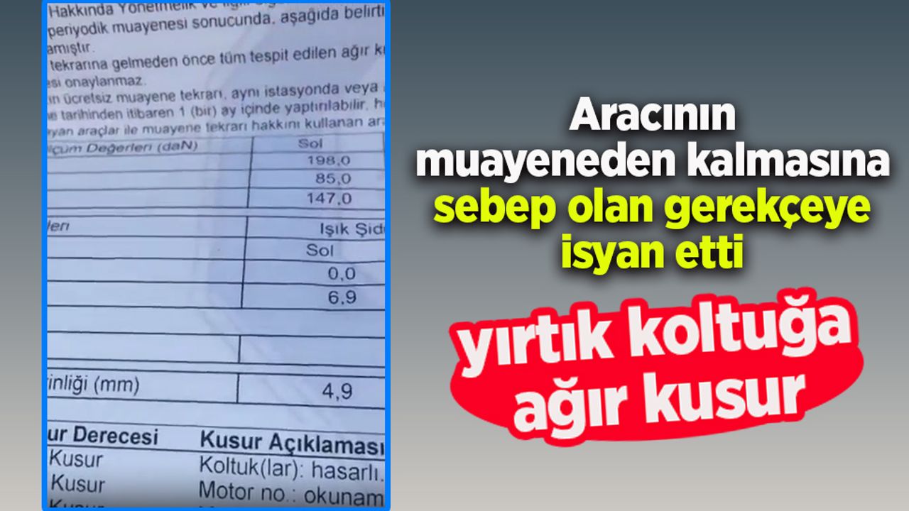 Araç muayenesi için TÜVTÜRK istasyonuna giden bir vatandaş, koltuk kılıfındaki küçük bir sökük nedeniyle aracının "ağır kusurlu" sayılarak muayeneden bırakıldığını belirtti.