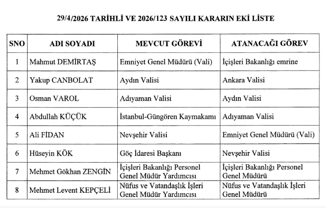 Resmi Gazete'de yayınlanan kararlarla birçok ile yeni vali atanırken emniyet genel müdürü de değişti. İşte o kararlar; Kaynak: gzt haber