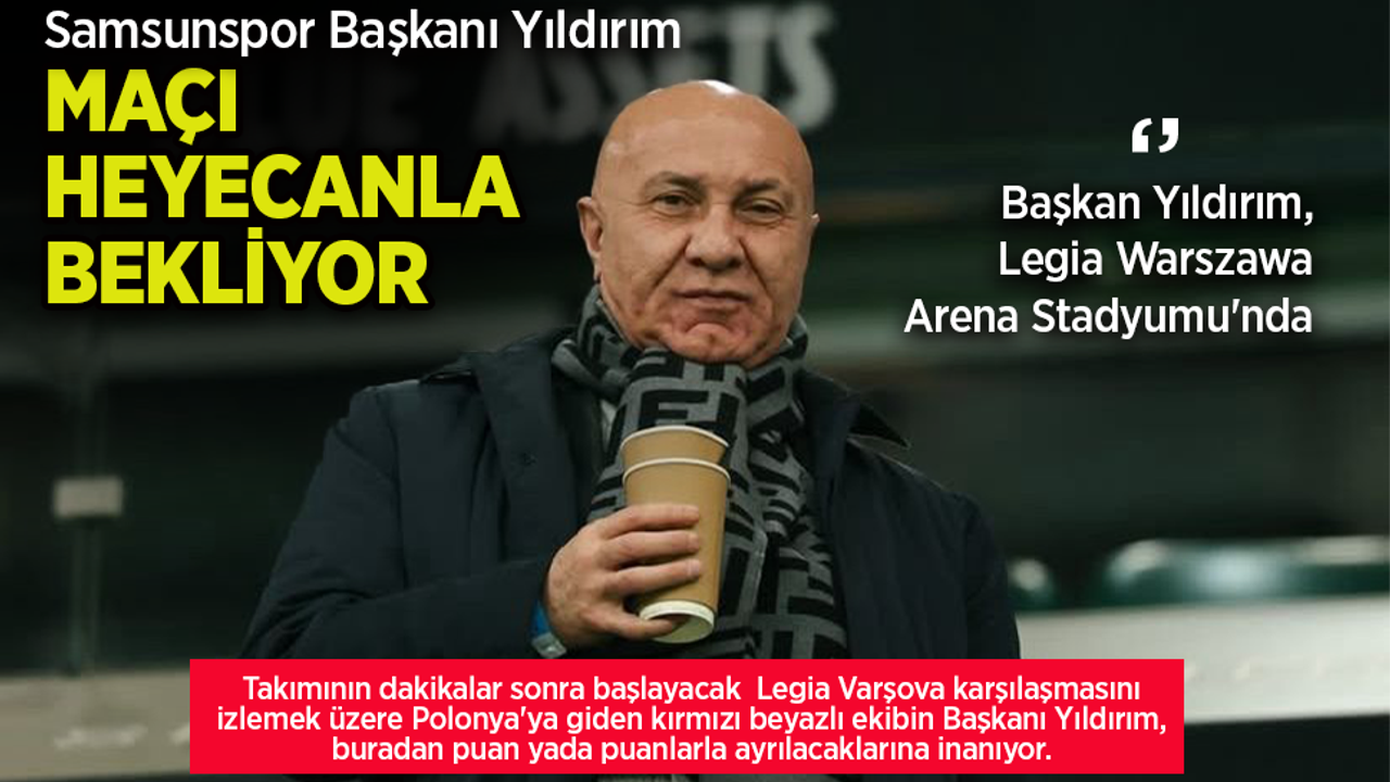 Samsunspor Başkanı Yüksel Yıldırım'ın heyecanlı bekleyişi... Takımının dakikalar sonra başlayacak Legia Varşova karşılaşmasını izlemek üzere Polonya'ya giden kırmızı beyazlı ekibin Başkanı Yıldırım, buradan puan yada puanlarla ayrılacaklarına inanıyor. Kahve içerek maç saatini bekleyen Samsunspor Başkanı Yüksel Yıldırım, pazar akşamı oynayacakları Fenerbahçe maçına moralle çıkmak için Varşova'dan iyi bir sonuçla ayrılmayı istediklerini söyledi.