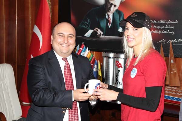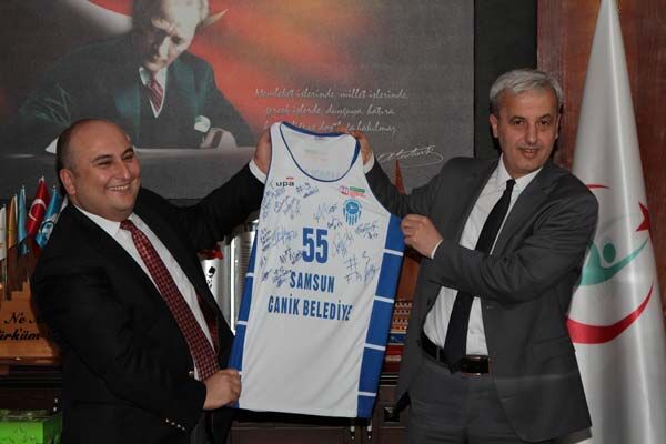 Samsun Haber – Ziyaret öncesi Samsun Kadın Doğum ve Çocuk Hastalıkları Hastanesi Başhekimi Uzm.Dr. Alaiddin Domaç, basketbolculara bardak hediye etti.