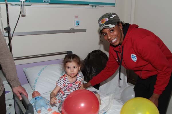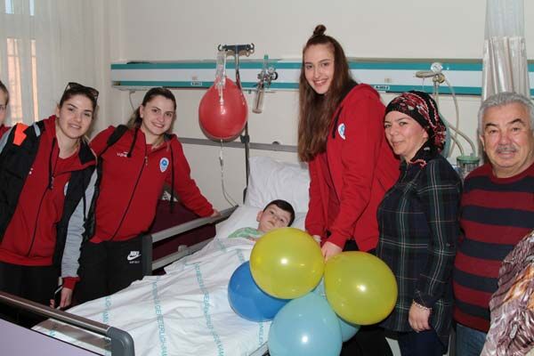 Ardından basketbolcu kızlar, serviste yatan minik hastaları ziyaret etti. Ziyarette miniklere balon ve oyuncak bebek hediye eden sporcular, çocuklarla bol bol sohbet ettiler.