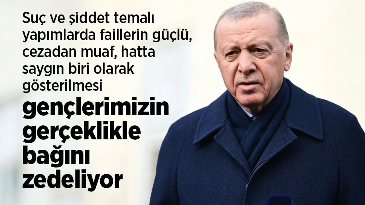 Cumhurbaşkanı Erdoğan: "Suç ve şiddet temalı yapımlarda faillerin güçlü, cezadan muaf, hatta saygın biri olarak gösterilmesi gençlerimizin gerçeklikle bağını zedeliyor."
