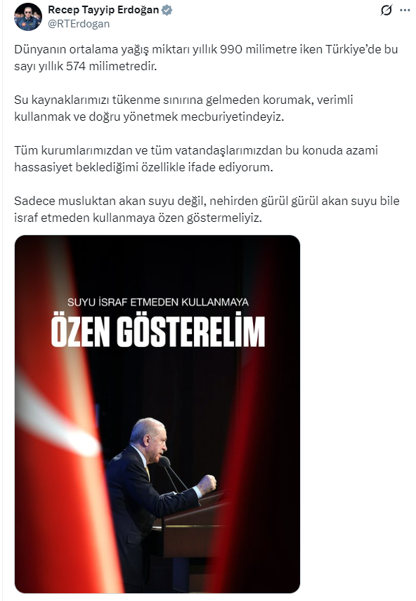 Cumhurbaşkanı Erdoğan, sadece evlerde kullanılan suyun değil, doğal kaynaklardan elde edilen suyun da dikkatli kullanılması gerektiğini söyledi. Açıklamasında şu ifadeler yer aldı:
