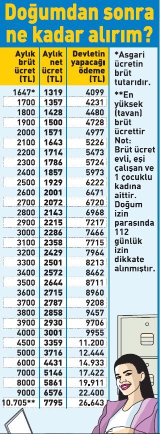 Buna göre asgari ücretle çalışırken hamilelik ve doğum nedeniyle 16 hafta izin kullanan sigortalı kadın 4099 lira iş göremezlik ödeneği alır ve ödeme son üç ayda alınan ‘brüt ücret'e göre yapılır. Aşağıdaki tabloda bordroda yazan brüt ücrete göre alınabilecek rapor paraları belirtilmiştir ve ödemeler PTT ve Ziraat Bankası aracılığıyla yapılmakta.
