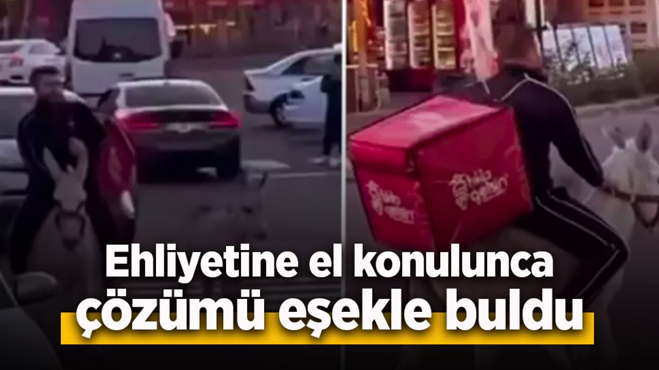 İzmir'in Kemalpaşa ilçesinde, trafik polisleri tarafından ehliyetine el konulan bir moto-kurye, mesleğini bırakmak yerine ulaşım aracını değiştirdi. Motosikleti altından alınan kurye, sipariş paketini sırtına takıp eşekle trafiğe çıktı.