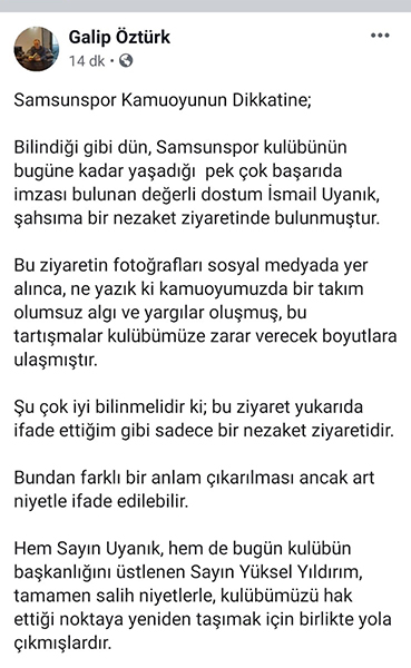 Her daim Samsunspor'un yanında olmaya devam edeceğini ve tüm gücüyle mevcut yönetimin ve Samsunspor'un yanında olacağını ifade eden Öztürk, sosyal medya hesabından şu sözlere yer verdi: "Samsunspor kamuoyunun dikkatine;