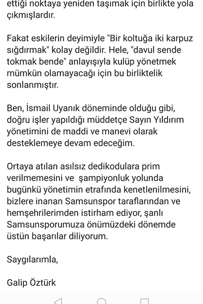 Ortaya atılan asılsız dedikodulara prim verilmemesini ve şampiyonluk adına bugünkü yönetim etrafında kenetlenilmesini, bizlere inanan Samsunspor taraftarlarından ve hemşehrilerimden istirham ediyor, şanlı Samsunspor'umuza önümüzdeki dönemde üstün başarılar diliyorum."