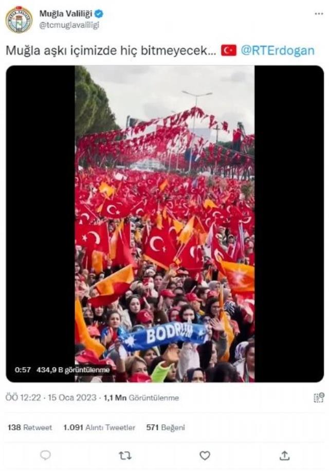 Muğla Valiliği, resmi Twitter hesabından ve internet sitesinden "Muğla aşkı içimizde hiç bitmeyecek, Recep Tayyip Erdoğan" notuyla paylaşım yaptı. Paylaşımda Cumhurbaşkanı Erdoğan'ın Muğla mitinginden fotoğraf ve videolar yer aldı. Paylaşıma siyasilerden tepki yağdı. Valilik ise, paylaşıma yapılabilecek yorumları kısıtladı.