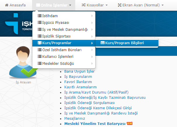 Açılan sayfada iş arayan kısmından kimlik numaranız ve şifrenizle giriş yapın. Giriş yaptıktan sonra aşağıdaki ekran karşınıza çıkacaktur. Bu ekranda gösterilen adımları takip ederek kurs başvuru sayfasına gidin.