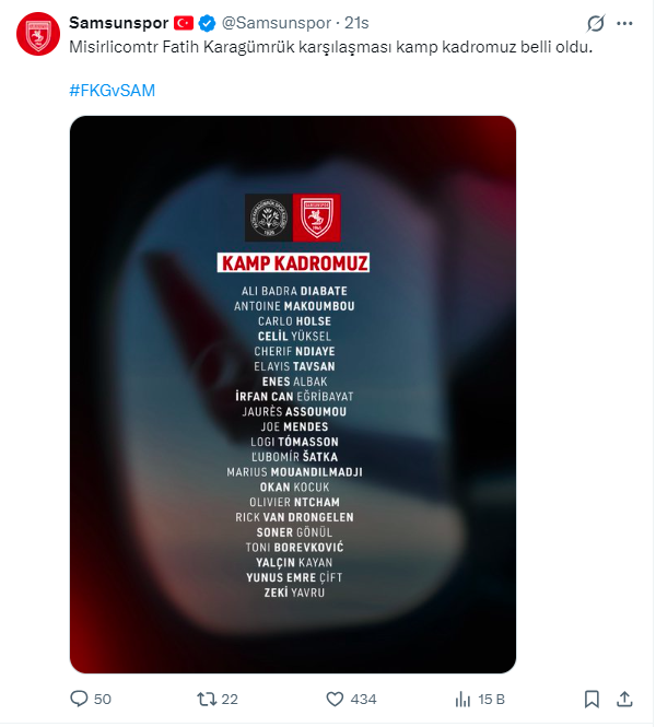 Samsunspor Haber - Samsunspor'un bu akşam deplasmanda oynayacağı Fatih Karagümrük maçının kamp kadrosu da belli oldu. Kırmızı beyazlı ekibin yeni teknik direktörü Thorsten Fink'in tarafından belirlenen kadroda kimler var ? Yeni teknik direktör Thorsten Fink yönetiminde ilk lig maçına çıkacak olan kırmızı-beyazlı kafile, kritik mücadele için İstanbul'a gitti. Kırmızı-beyazlıların paylaştığı kamp kadrosunda şu isimler yer alıyor: