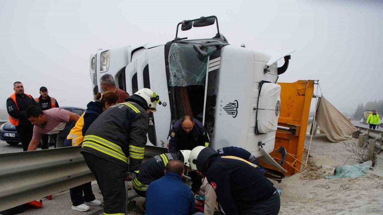 Edirne’de devrilen kum yüklü hafriyat tırında sıkışan sürücü, itfaiye ekiplerince çıkarılarak yaralı halde hastaneye kaldırıldı.