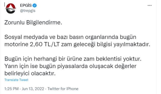 EPGİS'in açıklamasında motorine bugün zam geleceği iddialarının gerçeği yansıtmadığı belirtilerek, "Zorunlu Bilgilendirme. Sosyal medyada ve bazı basın organlarında bugün motorine 2,60 TL/LT zam geleceği bilgisi yayılmaktadır. Bugün için herhangi bir ürüne zam beklentisi yoktur. Yarın için ise bugün piyasalarda oluşacak değerler belirleyici olacaktır" ifadelerine yer verildi.