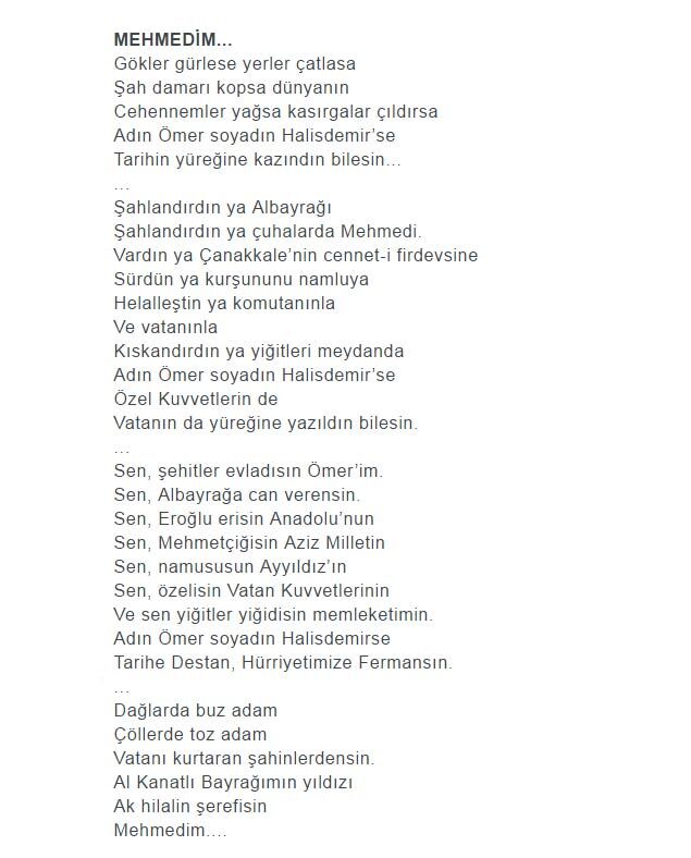 'Kırmızı Yağmurlar' isimli bir şiir kitabı olan 61 yaşlarındaki Şair ve aynı zamanda Gazeteci Mustafa Holoğlu da, Kıdemli Başçavuş Ömer Halisdemir için duygu dolu olan bir şiiri kaleme almıştır. İlk önce, Fatih Kısaparmak'ın seslendirmiş olduğu 'İki Gözüm İki Çeşme' şarkısının söz yazarı olan Mustafa Holoğlu, 'Vatan Şairi' Namık Kemal'in yaşamını kaleme alan bir şarkı sözü de yazmıştı. 'Bir Varmışsın, Bir Yokmuşsun' isimli şarkıyı Berrin Kayran seslendirmiştir. İşte Mustafa Holoğlu'nun Şehit Kıdemli Başçavuş Ömer Halisdemir için yazmış olduğu dizeler:
