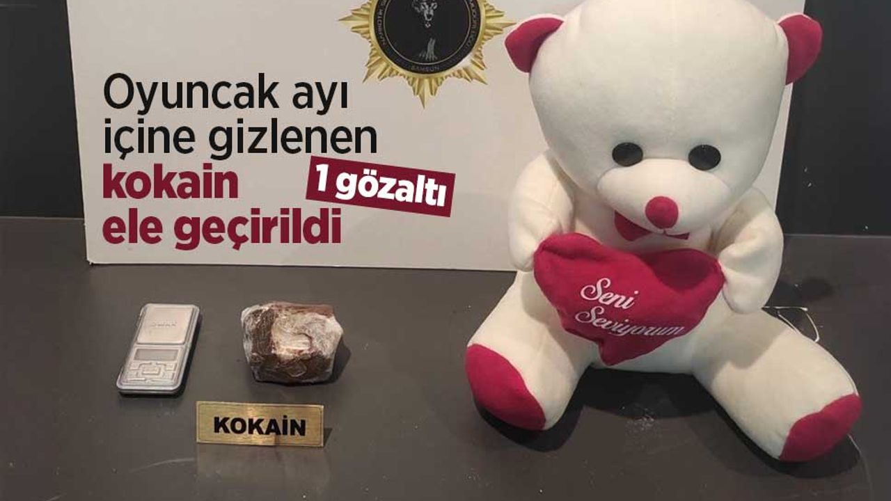 Yapılan aramada oyuncak bir ayının içerisine zulalanmış 150 gram kokain ile 1 hassas terazi bulundu.