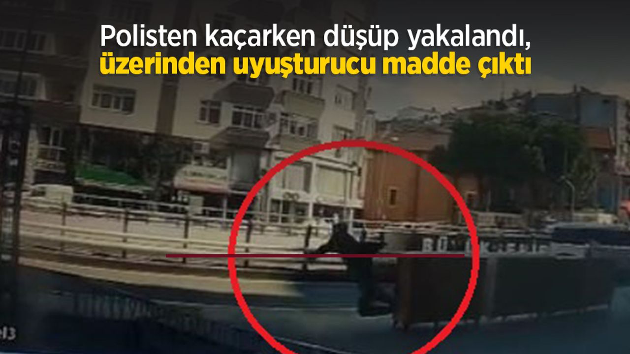 Şüphelinin, ayağının tökezleyip, polise yakalandığı anlar bir iş yerinin güvenlik kamerasıyla kaydedildi.