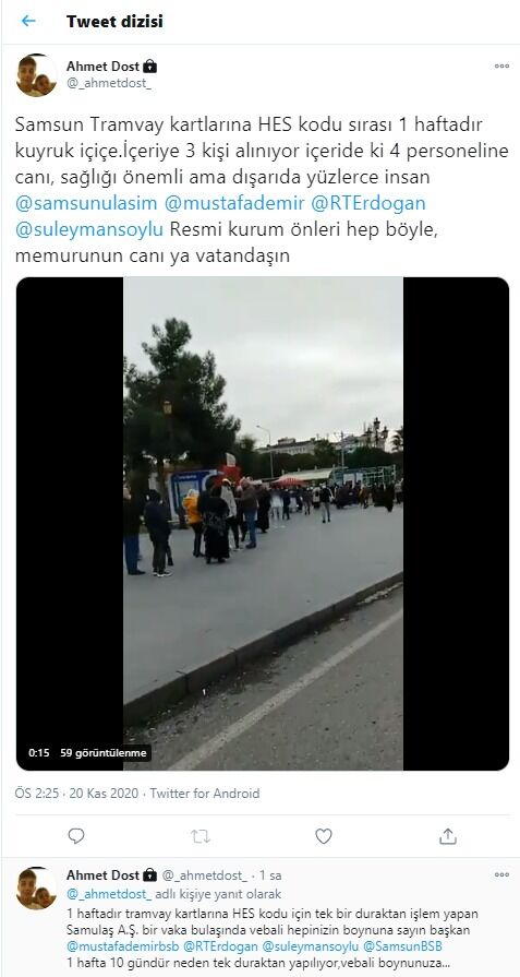 HES kodunu tramvay duraklarından ve SAMULAŞ bayilerinden ekletmek isteyen onlarca vatandaşlar uzun kuyruklar oluşturdu. Oluşan kuyruklarda sosyal mesafe güvenliği sağlanamazken virüsün yayılmasına davetiye çıktı.