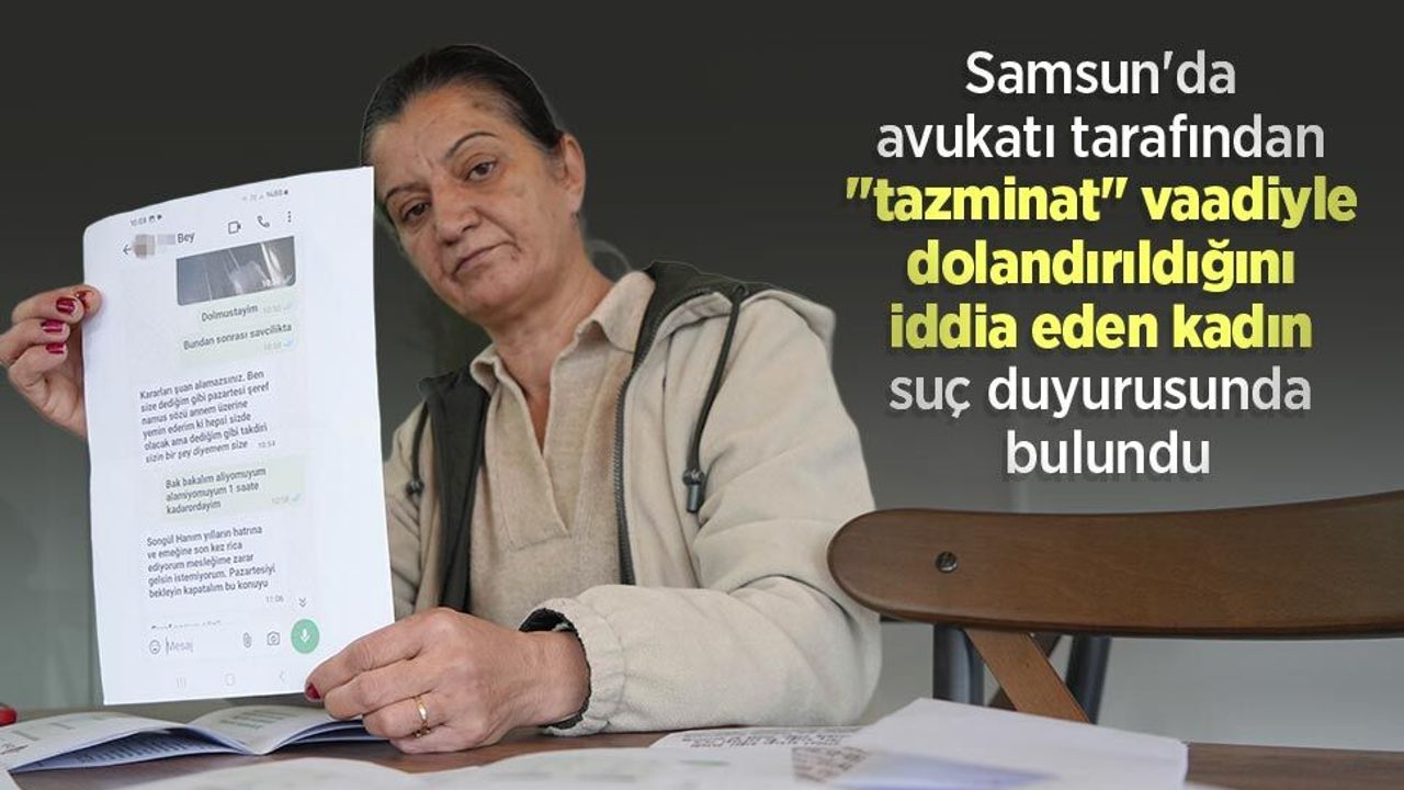 Atakum ilçesinde yaşayan 49 yaşındaki Songül Çiftçi, avukatı İ.C.S.'nin kendisine 281 bin TL tazminat kazandıklarını ancak parayı alabilmek için 35 bin TL yatırmak zorunda olduklarını söyleyerek para aldığını, yıllarca hem aldığı parayı hem de tazminatı vermediğini öne sürerek savcılığa suç duyurusunda bulundu. Yaşananları anlatan Çiftçi, "Avukatım İ.C.S., velayet ve nafaka davalarımda hakkımda bir tazminat çıktığını, 281 bin lira hak kazandığımı, bunun için 35 bin lira ödemem gerektiğini söyledi. Ben de bileziğimi bozdurdum ve ona 35 bin lira verdim. Sonrasında ‘şu gün, bu gün yatacak' diyerek beni oyaladı. Üstelik üzerine anlaştığımız velayet ve nafaka davalarını da açmamış. ‘Davalarda gizlilik kararı olduğunu, bu yüzden göremeyeceğimizi' söyledi. Bu olayların sonunda savcılığa da başvuruda bulundum. Şu an kendisi İzmir'de ikamet ediyor. Bana çok küçük rakamlar halinde ödemeler gönderdi. Son verdiği ödeme sözünü de tutmadı" dedi.