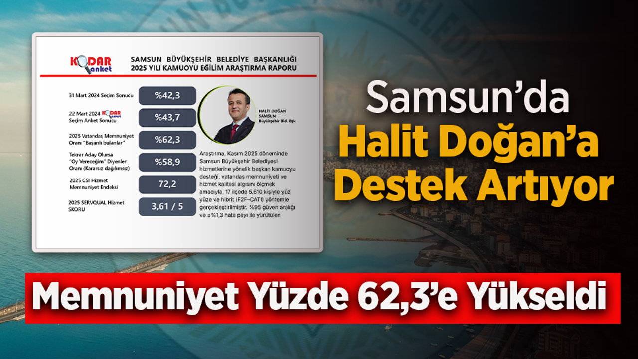 2025 yılı kamuoyu eğilim araştırmasında, Samsun Büyükşehir Belediyesi hizmetlerini başarılı bulan vatandaşların oranı yüzde 62,3 oldu. Araştırma, belediyenin yürüttüğü çalışmaların kamuoyunda olumlu karşılık bulduğunu ortaya koydu.