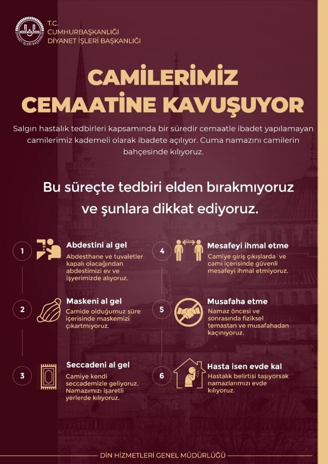18 Mayıs 2020 Pazartesi günü Cumhurbaşkanımız Sayın Recep Tayyip Erdoğan’ın Başkanlığında toplanan Cumhurbaşkanlığı Kabinesinde yapılan değerlendirmeler sonucu, Bilim Kurulunun önerileri, ilgili Bakanlıklar ve Diyanet İşleri Başkanlığınca belirlenecek kurallar çerçevesinde öğle, ikindi ve Cuma namazlarının camilerimizde 29 Mayıs 2020 Cuma gününden itibaren cemaatle kılınabileceğine ilişkin karar alınmıştır.