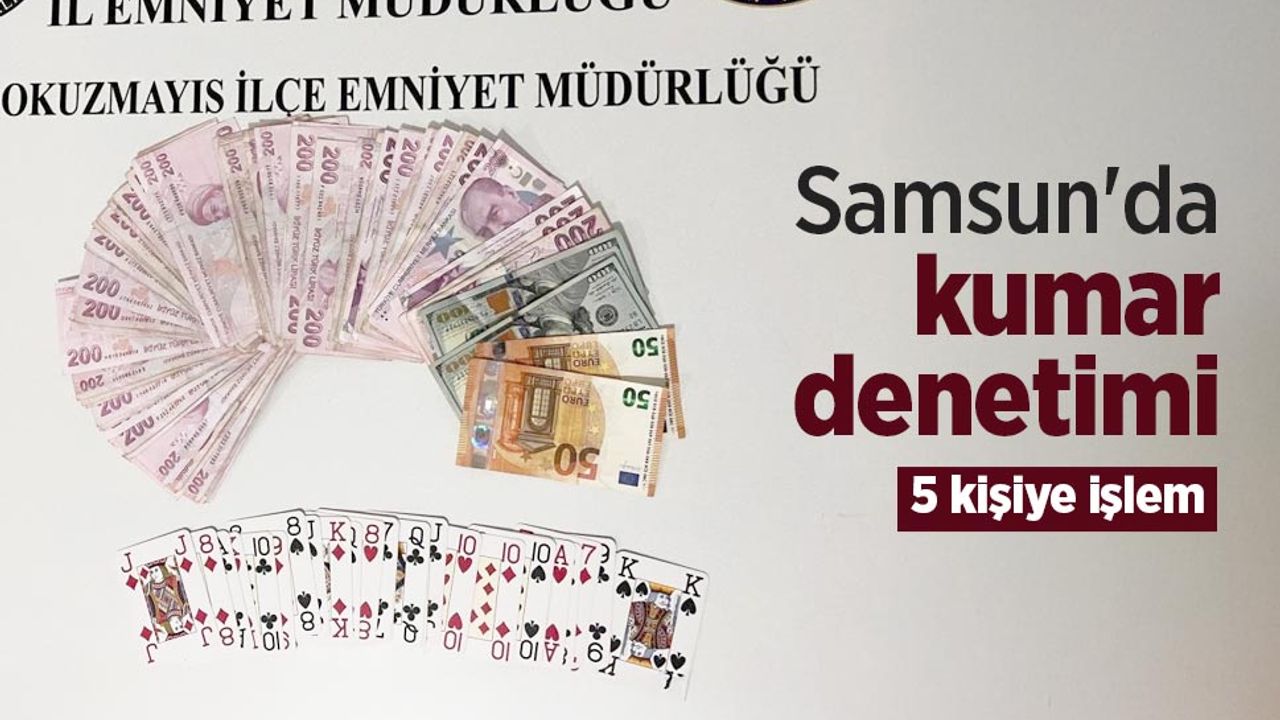 19 Mayıs İlçe Emniyet Müdürlüğü ekipleri tarafından, 'kumar oynanması için yer ve imkân sağlama' suçuna yönelik yürütülen denetimler kapsamında bir iş yerinde kontrol gerçekleştirildi. Yapılan kontrollerde, iş yeri içerisinde bulunan masada oturan Y.Y., İ.Y., S.B., İ.K. ve N.D. isimli şahısların iskambil kâğıtlarıyla kumar oynadıkları tespit edildi. Kumar oynandığı belirlenen masa üzerinde 22 bin 400 TL, 200 Amerikan doları ve 100 euro ele geçirildi.