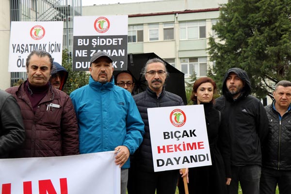 Daha sonra basın açıklamasını okuyan Türk Tabipleri Birliği Genel Sekreteri Dr. Bülent Nazım Yılmaz, “Yüzlerce arkadaşımız, çalıştığı kurumlarda ölümle yüz yüze geldiler. Kimi zaman Suruç’ta olduğu gibi hastaneler basıldı, kimi zaman da Şanlıurfa’da tanıklık ettiğimiz gibi hekimlerin kafalarında kaldırım taşları parçalandı. Bazen İzmir’de olduğu gibi aile sağlık merkezleri basılarak hekimlerin kafası kırıldı. Sağlıkta şiddet bitmiyor. Gün geçmiyor ki yeni ve planlanmış saldırılarla karşı karşıya kalmayalım. Bu doğrultuda 17 Nisan’ın Sağlıkta Şiddetle Mücadele Günü olarak kabul edilmesinin ve sağlıkta şiddeti önlemeye yönelik yasa talebimizin yaşama geçirilmesinin önemli bir adım olacağını tüm kamuoyu önünde Sağlık Bakanlığından talep ediyoruz” ifadelerini kullandı.