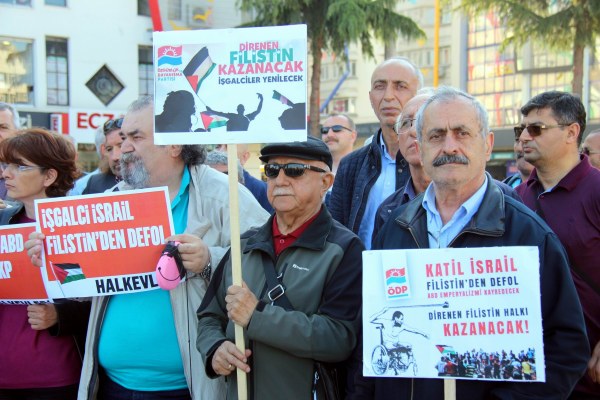 Pankart açıp sloganların atan öfkeli kalabalık adına konuşan ESK Dönem Sözcüsü Mustafa Niyazi Bulut, “ABD ve İsrail’in emperyalist amaçları doğrultusunda Kudüs’ü iç politika malzemeleri yapmaları çözüm yerine çözümsüzlüğü, barış içerisinde bir yaşam yerine çatışma ve kaosu derinleştirmektedir. Şiddet ve insanlık dışı uygulamalar derhal sonlandırılmalı, Filistin ve İsrail halkının bir arada ve barış içerisinde yaşamaları için gerekli siyasal adımlar atılmalıdır” dedi.