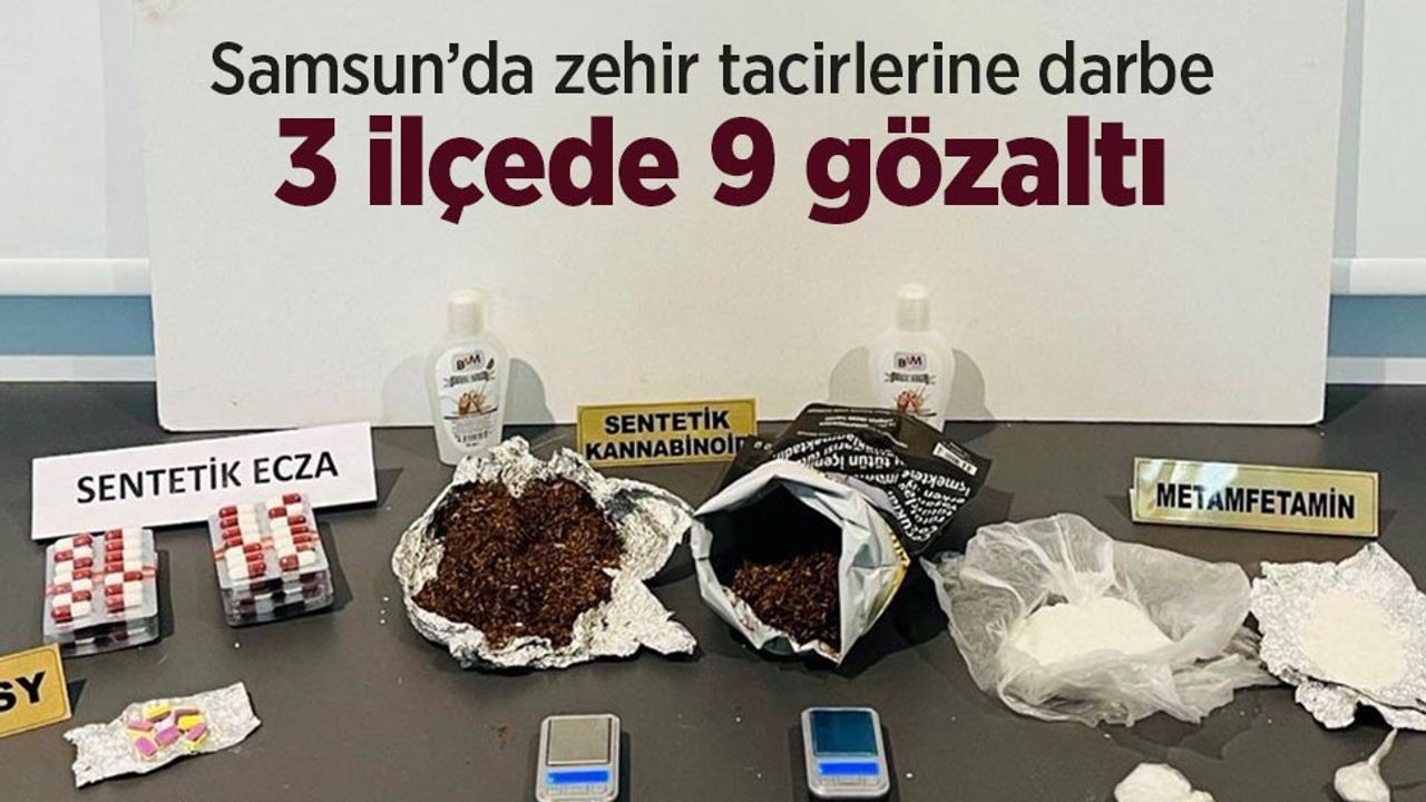 Samsun İl Emniyet Müdürlüğü Narkotik Suçlarla Mücadele Şube Müdürlüğü ekipleri, uyuşturucu madde ticareti ve kullanımının engellenmesine yönelik yürüttüğü çalışmalar kapsamında İlkadım, Canik ve Terme ilçelerinde önceden belirlenen adreslere eş zamanlı operasyon gerçekleştirdi. Operasyon çerçevesinde 9 şüphelinin üzerlerinde, araçlarında ve ikametlerinde detaylı arama yapıldı.