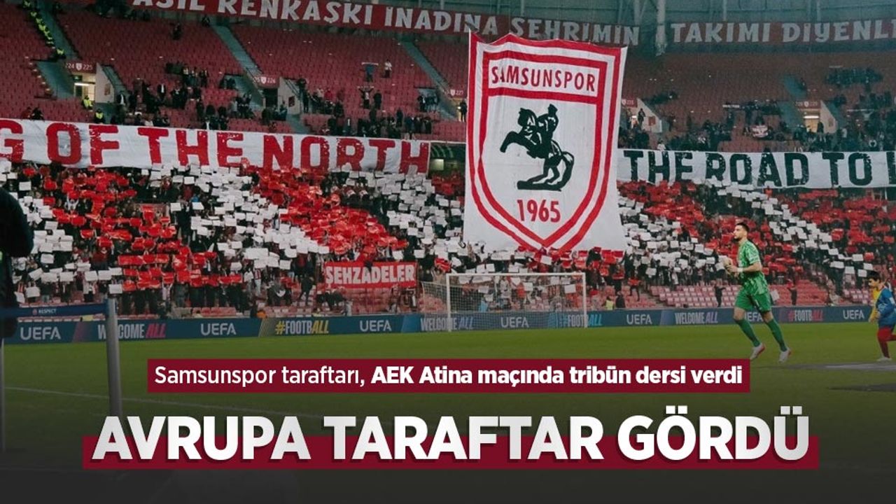 Samsunspor Haber - Samsunspor taraftarı, UEFA Konferans Ligi'nde AEK Atina ile oynanan kritik karşılaşma öncesinde günler öncesinden hazırlıklarını tamamladığı muhteşem bir koreografiye imza attı. 19 Mayıs Stadyumu'nun tüm tribünlerinden sergilenen bu görsel şölen, büyük bir coşkuyla gerçekleştirildi. Yaklaşık 18 bin taraftarın izlediği mücadelede, Kırmızı-Beyazlı taraftarlar sadece görsel anlamda değil, aynı zamanda verdikleri mesajlarla da tribünlere damga vurdu. Tribünlerde yapılan koreografi, ışık şovlar ve açılan pankartlar stadyumu tam bir görsel şölen alanına çevirdi. Taraftarlar, açtıkları kırmızı beyazlı pankartlar ile takımlarına destek verdi. Stadyum, Kırmızı-Beyazlı bayraklarla süslenerek muhteşem bir görsel şölen oluşturdu.