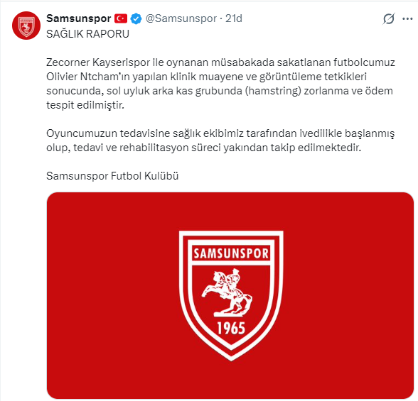 Samsunspor’da orta saha oyuncusu Olivier Ntcham’dan üzen haber geldi. Kırmızı-beyazlı kulüp, Kayserispor ile oynanan karşılaşmada sakatlanan futbolcunun sağlık durumuna ilişkin resmi açıklama yaptı.