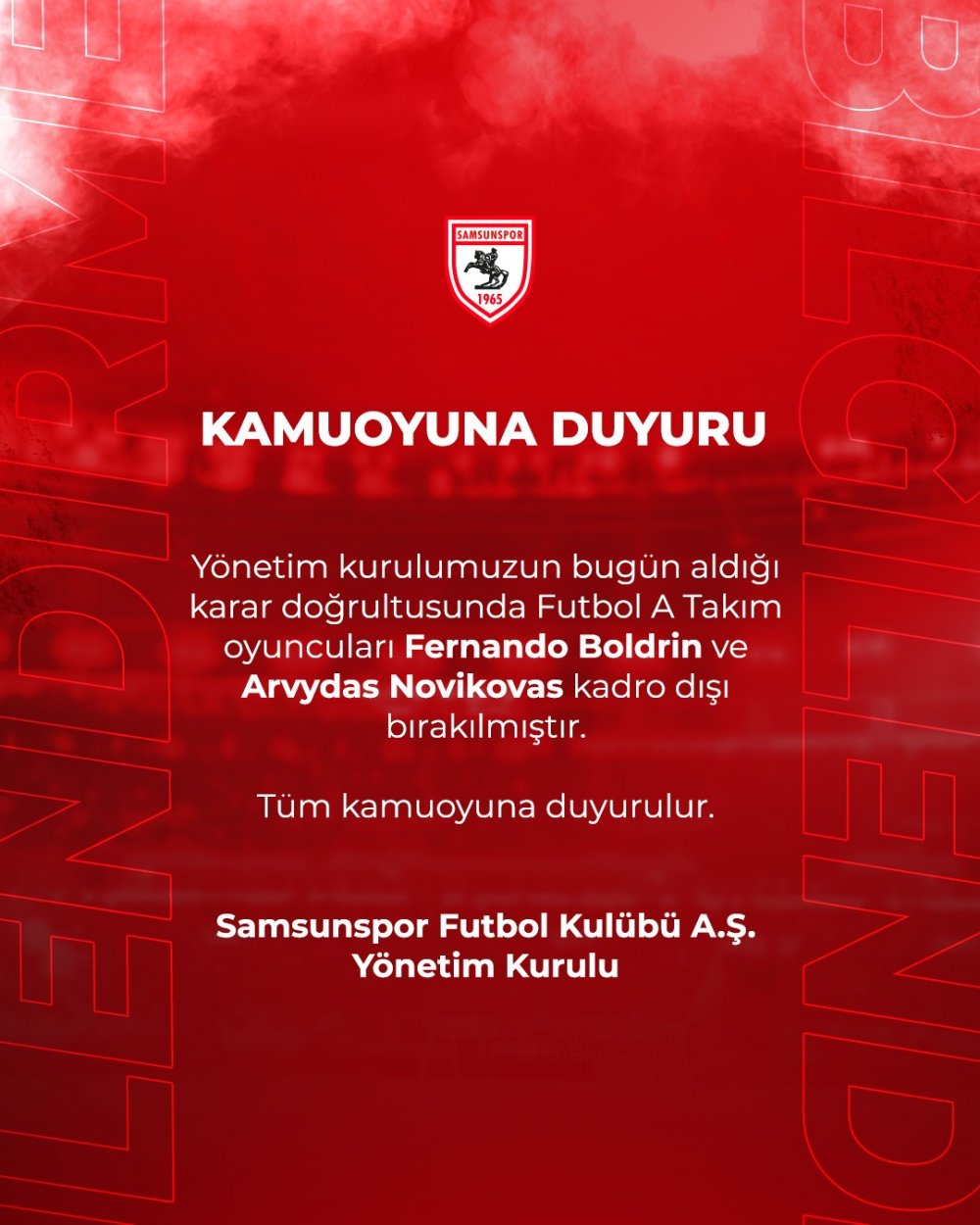 Samsunspor klübünden son dakika açıklaması geldi. Resmi hesaplardan yapılan açıklamada A takım oyuncularından Fernando Henrique Boldrin ve Arvydas Novikovas’ın kadro dışı bırakıldığını duyurdu.