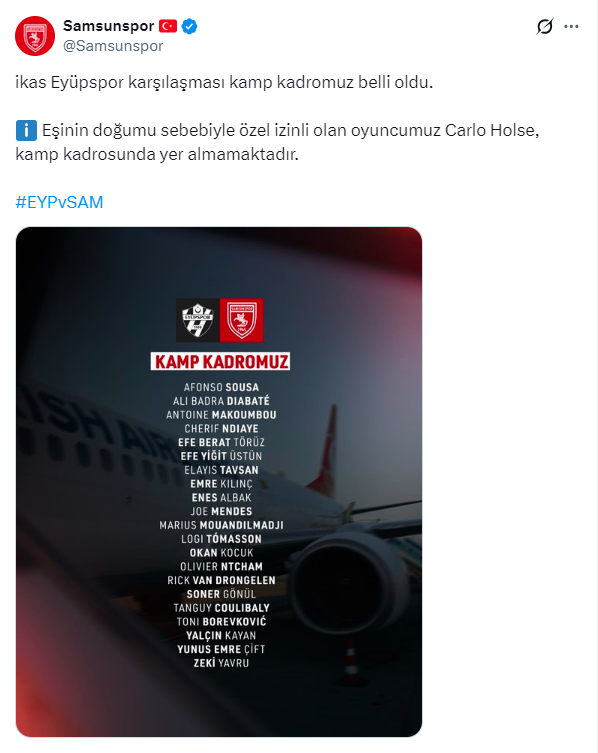 Samsunspor Haber - Samsunspor'un yarın akşam İstanbul'da konuk olacağı zorlu Eyüpspor maçı öncesi kamp kadrosu belli oldu. Kırmızı beyazlı ekibin mutlak galibiyet hedefiyle çıkacağı kritik 90 dakika öncesi Samsunspor'da Carlo Holse şoku yaşandı. Danimarkalı yıldızın eşi doğum yaptı. Yönetim oyuncuya bu maçta özel izin verdi. Eşinin ve çocuğunun yanında olan Holse, Eyüpspor karşısında forma giyemeyecek. Recep Tayyip Erdoğan Stadı’nda oynanacak olan zorlu müsabaka saat 20.00’de başlayacak. Karşılaşmanın orta hakemliğini ise Yasin Kol üstlenecek. Teknik direktör Thorsten Fink tarafından açıklanan Eyüpspor kamp kadrosunda şu isimler yer alıyor;