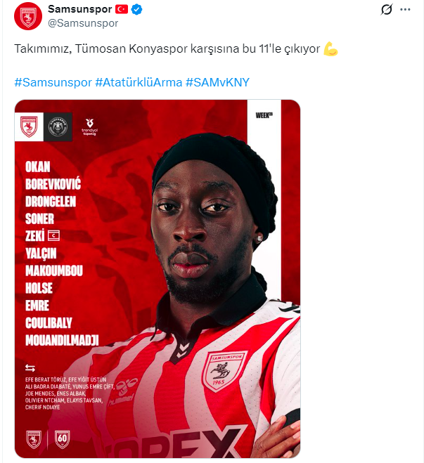 Trendyol Süperlig'in 28. haftasında Samsunspor, Konyaspor ile karşı karşıya gelecek. Kırmızı beyazlı ekip bir saat içinde başlayacak Konyaspor maçında şu on birle sahada yer alacak;