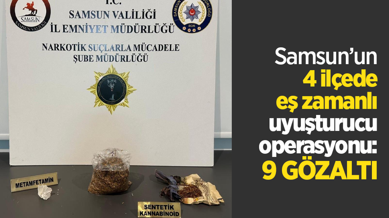 Edinilen bilgiye göre, Samsun İl Emniyet Müdürlüğü Narkotik Suçlarla Mücadele Şube Müdürlüğü ekiplerince, yürütülen planlı operasyonlar kapsamında İlkadım, Canik, Bafra ve Çarşamba ilçelerinde eş zamanlı olarak uyuşturucu operasyonu düzenlendi. 9 şahsın üst, araç ve ikametlerinde yapılan aramalarda çok sayıda uyuşturucu madde ve suç unsuru ele geçirildi.