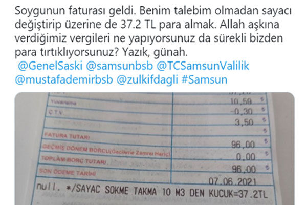 "Soygunun faturası geldi. Benim talebim olmadan sayacı değiştirip üzerine de 37.2 TL para almak. Allah aşkına verdiğimiz vergileri ne yapıyorsunuz da sürekli bizden para tırtıklıyorsunuz? Yazık, günah."
