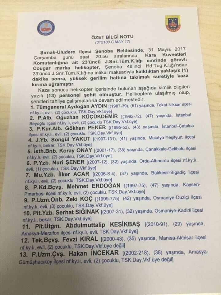 Şırnak Şenoba yakınlarında TSK'ya ait bir helikopter henüz sebebi bilinmeyen bir nedenle düştü. Düşen helikopterde üst düzey bir komutanın da bulunduğu bilgisine ulaşıldı. Söz konusu olayda Tümen Komutanı dahil olmak üzere 13 şehit olduğu bildirildi. Şehit olan 13 askerin memleketleri şu şekilde: