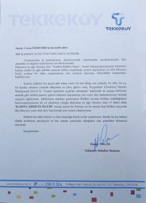 Özgecan Aslan, Pınar Gültekin, Emine Bulut, Ceren Özdemir ve Emriye Meteoğlu’nun ailelerine formanın yanı sıra mektup da gönderen Tekkeköy Belediye Başkanı Hasan Togar mektupta, “Kadına şiddetin her geçen gün utanç verici bir hal aldığı son yıllarda bir abla bir eş bir kardeş olmanın yanında dünyanın en yüce görevi olan, Peygamber Efendimiz Hz. Muhammed (SAV)’in ‘Cennet annelerin ayaklarının altındadır’ hadisinde de açıkça belirtilen annelik gibi tarifsiz manevi görevi üstlenen, hayatımıza yön veren tüm kadınlarımızın önünde saygıyla eğiliyorum. Samsunsporumuzun bu yıl çıkartmış olduğu 15 dilde kadına şiddete hayır mesajı içeren bu formayı ve bu mesajı hep birlikte taşıyarak tüm dünyaya ‘yeter artık’ haykırmak için sizlere ulaştırıyoruz” ifadelerine yer verdi.