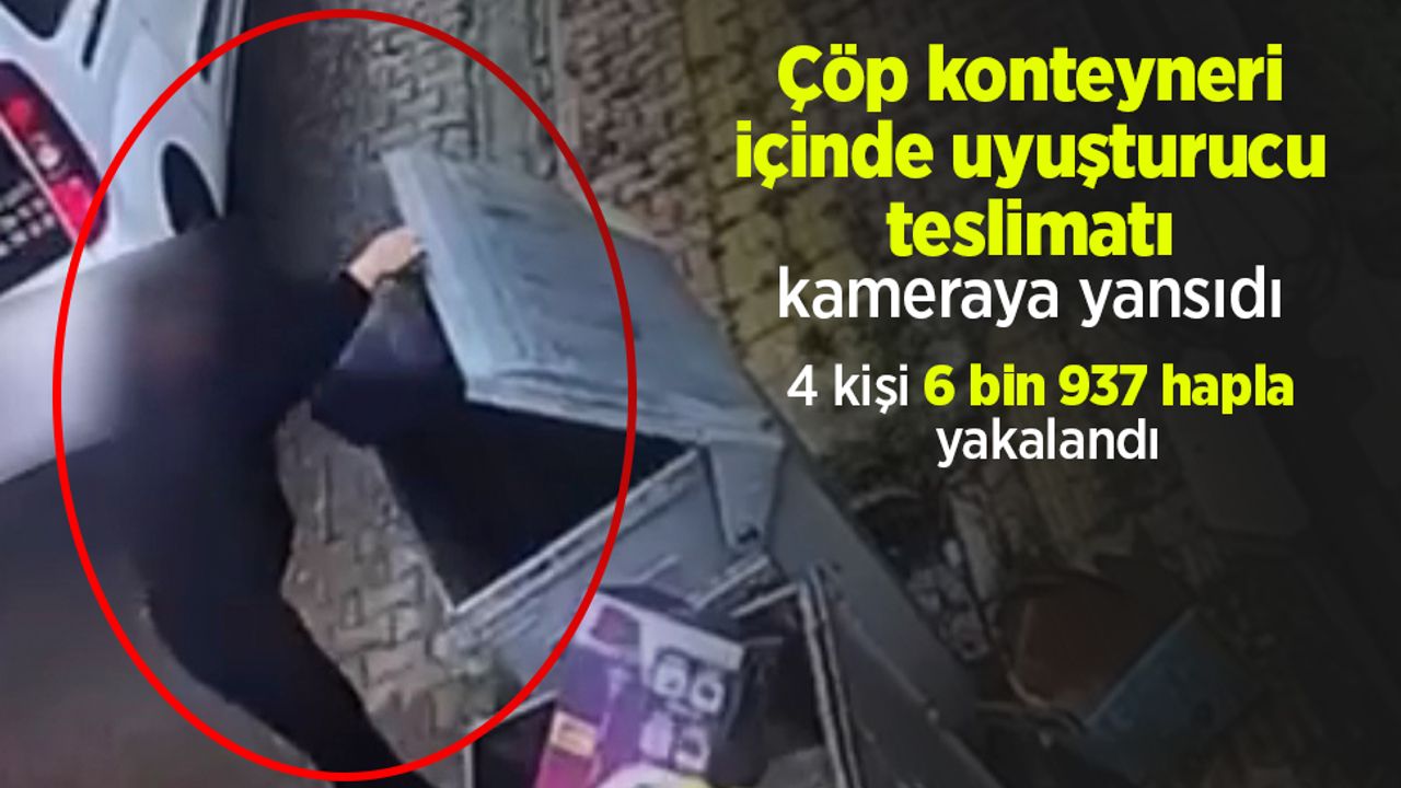 Çöp konteyneri içinde uyuşturucu teslimatı kameraya yansıdı: 4 kişi 6 bin 937 hapla yakalandı