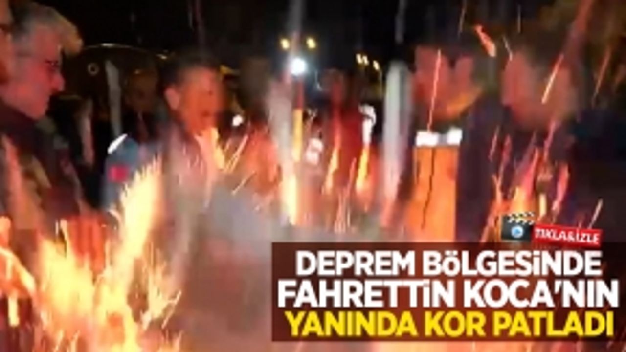 Deprem bölgesinde ateş başında ısınan sağlık personeli ile sohbet eden Sağlık Bakanı Fahrettin Koca, önünde durdukları korun patlaması ile büyük tehlike atlattı.