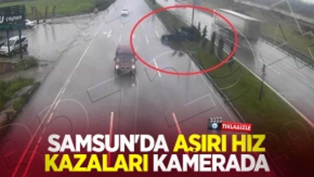 Samsun'da aşırı hız sonucu meydana gelen trafik kazalarında bir ticari taksinin uçarak park halindeki araçlara çarpması, bir otomobilin de refüjdeki çok sayıda ağacı biçmesi kameralara yansıdı.
