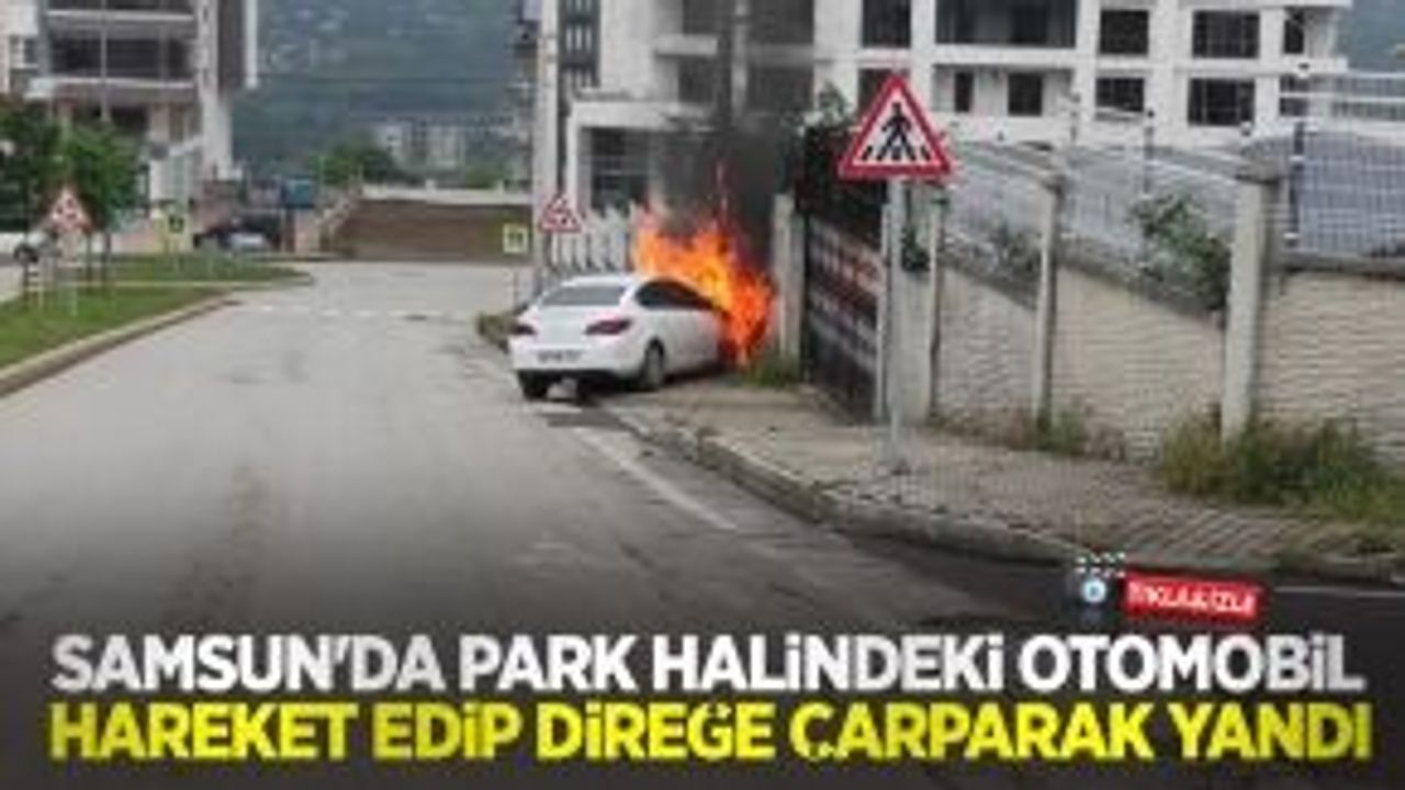 Samsun'da park halindeki bir otomobil rampa aşağı hareket ederek beton elektrik direğine çarpması sonucu alev alarak yandı.