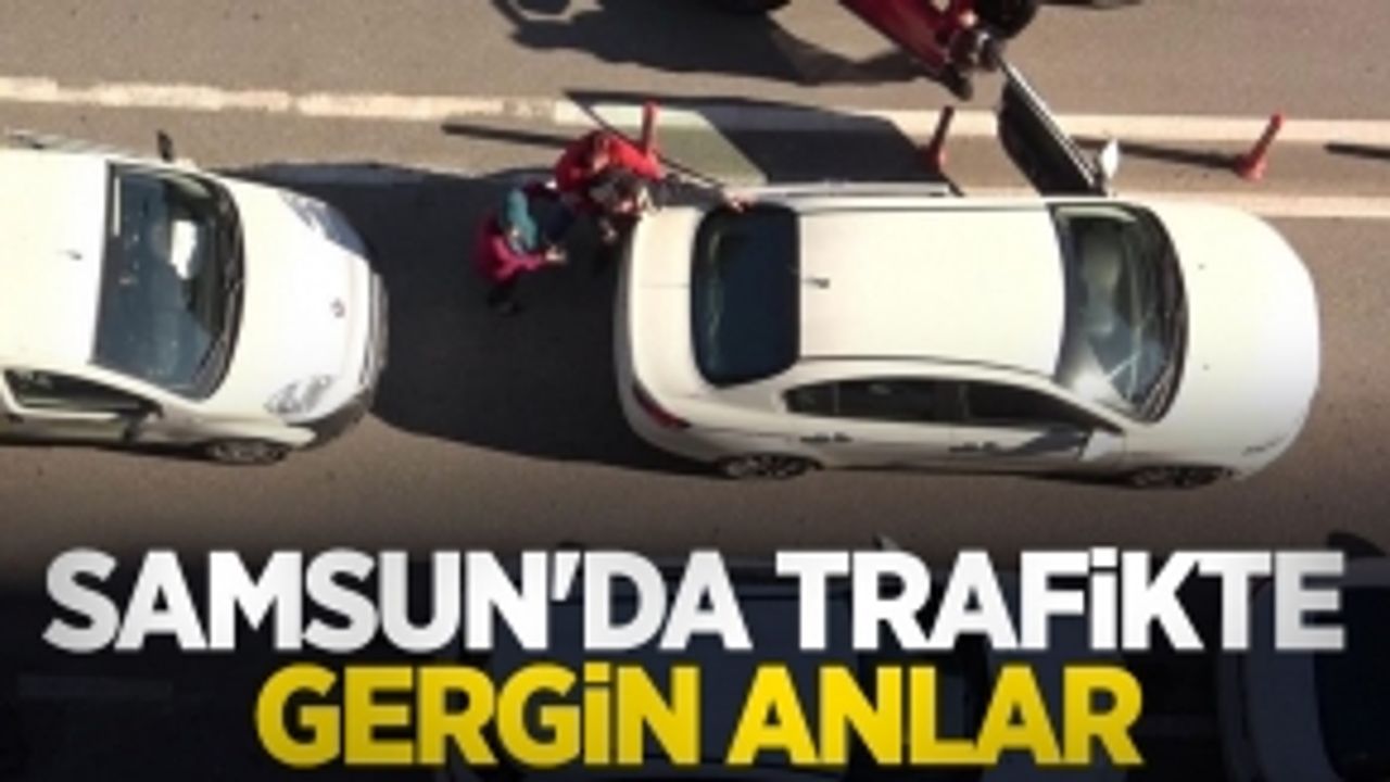 Samsun'da sabah saatlerinde meydana gelen olayda iki araç sürücüsü trafikte gerginlik yaşadı. Yol verme tartışması sonrası araçlarından inerek birbirleri üzerine yürüyen sürücüleri çevredeki vatandaşlar tuttu.