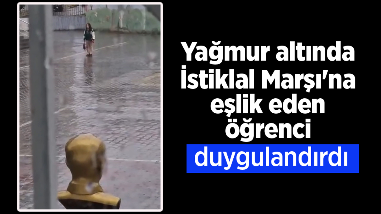 Iğdır'da dün haftanın ilk günü tüm okullarda olduğu gibi İnönü İlkokulu'nda da İstiklal Marşı okundu. Kentte etkili olan yağış nedeniyle marş, okulun hoparlör sistemi üzerinden tüm sınıflarda aynı anda okutuldu. Bu sırada derse geç kalan bir kız öğrenci, okul bahçesinde yağmurun altında durarak İstiklal Marşı'na eşlik etti. Marş bitene kadar yerinden ayrılmayan öğrencinin bu davranışı, öğretmenler ve öğrenciler tarafından izlendi. Yağmur altında İstiklal Marşı'nı okurken duygulandıran anlar cep telefonu kamerasına yansıdı.