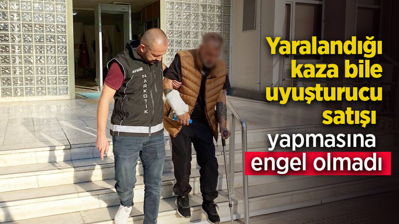 Aydın'ın Efeler ilçesinde gözaltına alınan 2 şüpheli sevk edildikleri adli makamlarca uyuşturucu madde ticareti yapmak suçundan tutuklanarak cezaevine gönderilirken, trafik kazası geçirdiği öğrenilen şüphelilerden biri koltuk değneği ile cezaevine gitti.