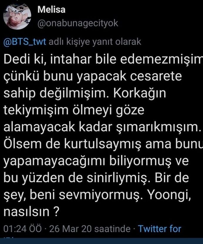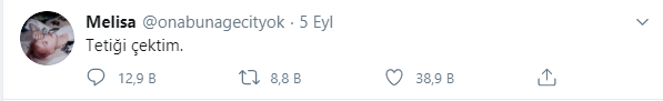 “İki yıldır değişmeyen şey sizin söylediklerinizle değişmeyecek. Şimdi lütfen bırakın biraz daha sakinleşip gideyim”, “Bir şey değişmeyecek, iki yıl oldu değişmeyecek”, “İçimde tutmak istemiyorum, aslında keşke ben yerime babam ölse” yazan Buse Melisa K., son paylaşımında ise “Tetiği çektim” diyerek bir tweet attı.